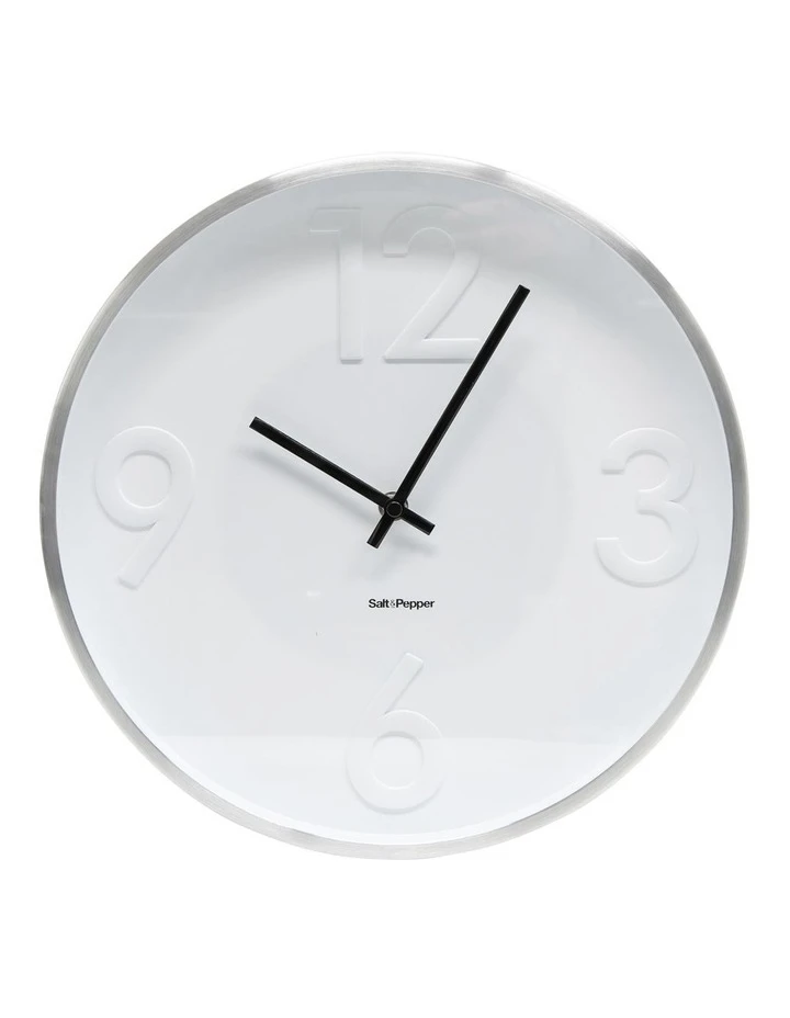 Stay stylish and on schedule with the Landon Clock, apart of salt&pepper’s Zone collection. With a minimalist design, this 31cm metal wall clock has a white face with silver accents and modern over-sized embossed numerals. Perfect for the kitchen, office or any wall space in your home.